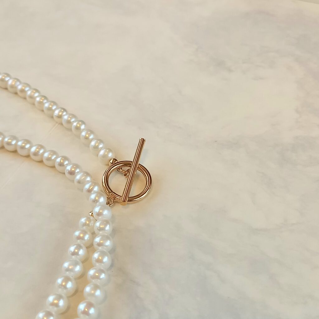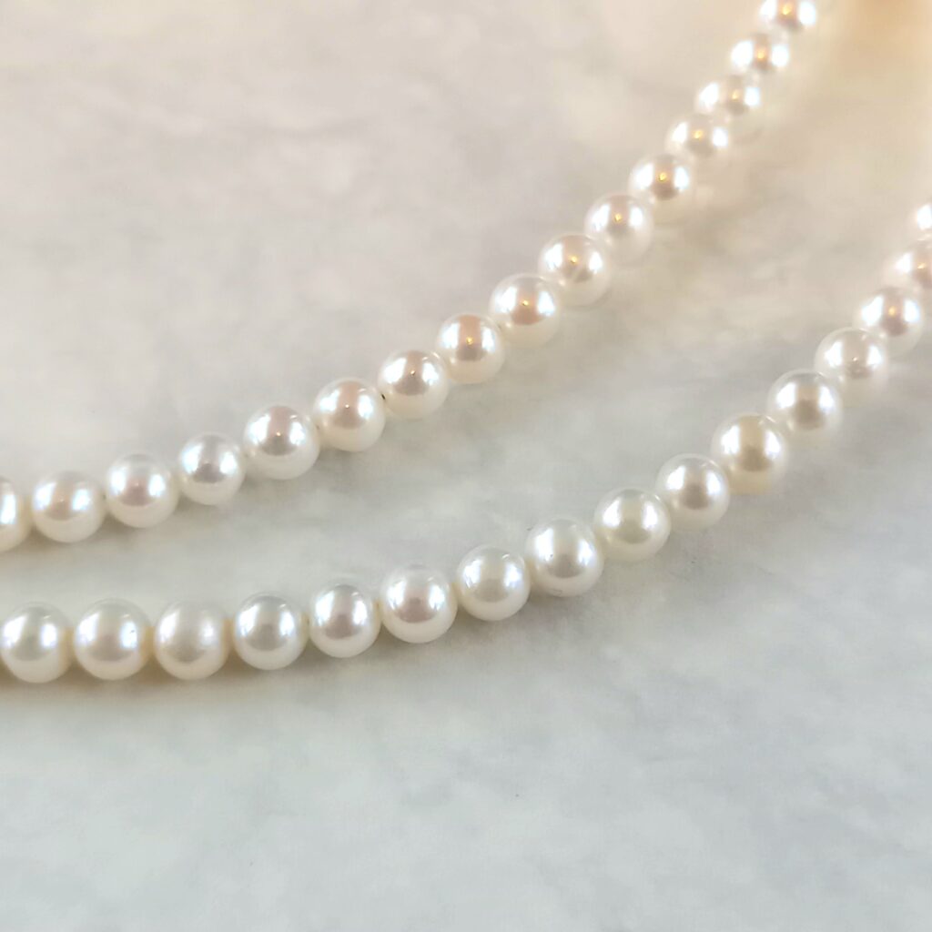 イミテーションパールとは違い、ひとつひとつのパールの形状と大きさが微妙に違うのが本物の証です。